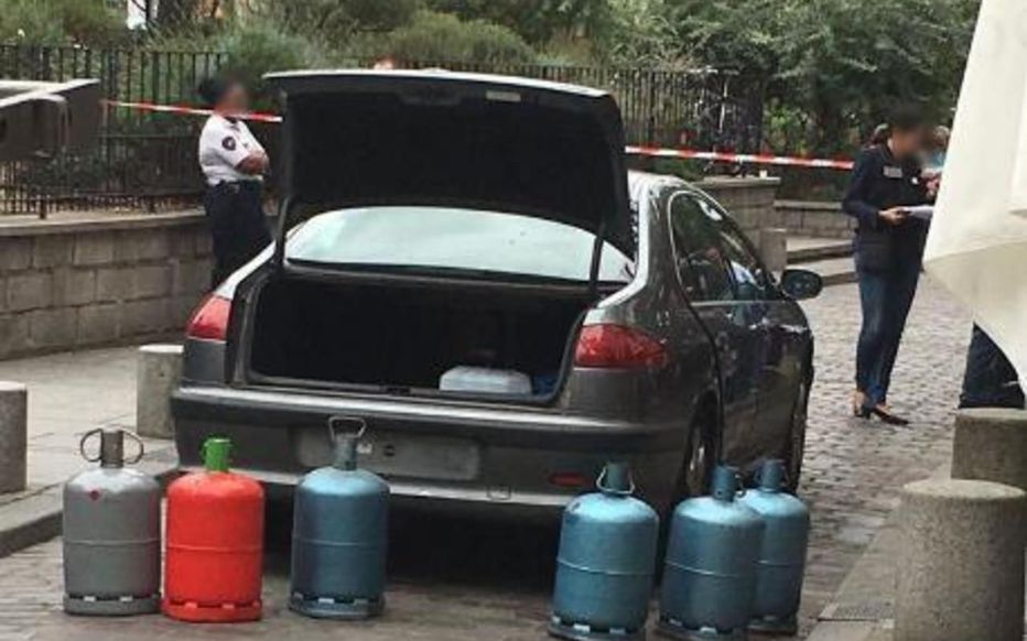 Die Polizei wird daher gerufen, die sich den Wagen, einen Peugeot 607, genauer ansieht. Beim Öffnen der Türen schlägt den Beamten starker Kraftstoffgeruch entgegen. Auf der Rückbank sind, unter einer dieselgetränkten Decke, sechs große Propangasflaschen gestapelt.
