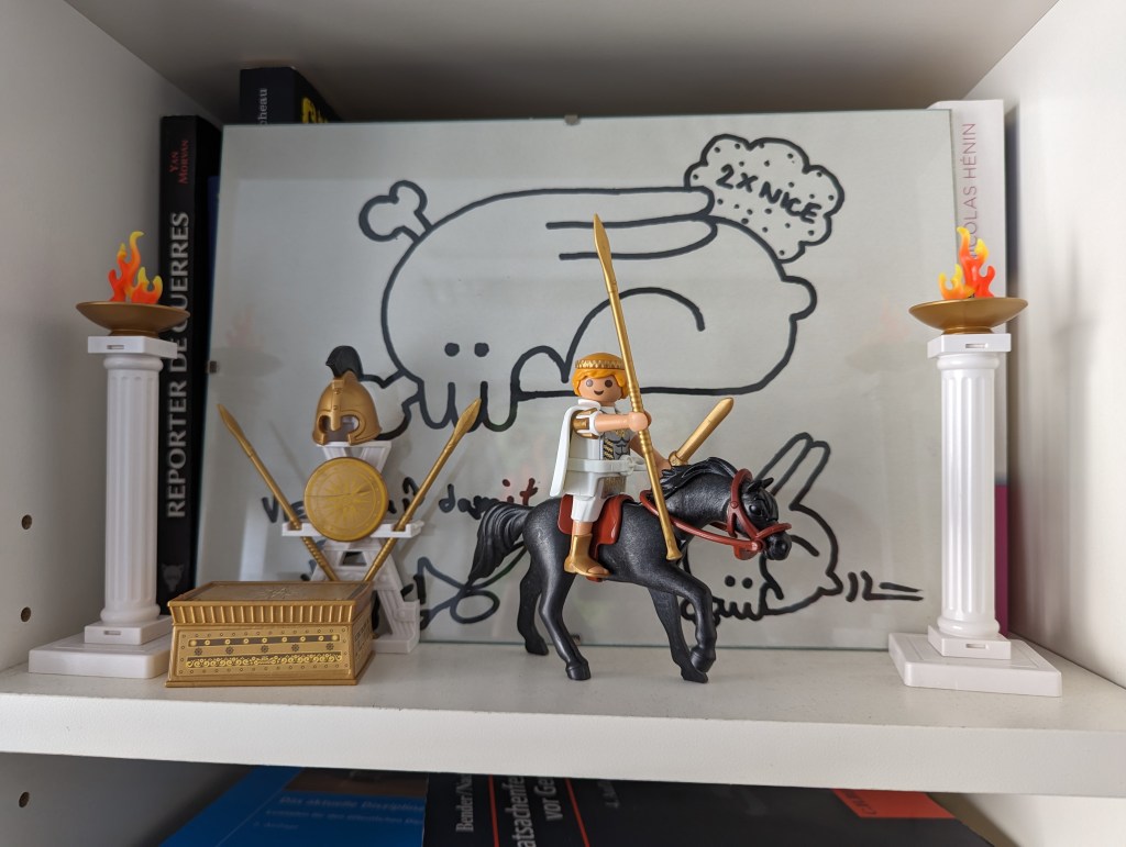 Seit Playmobil ein Set mit allen griechischen Göttern herausgebracht hat, konnte ich nicht widerstehen, mir „meine“ Athene zu kaufen, deren Blick ich manchmal suche, wenn mich alles anwidert. Sie schaut immer gleichmütig mit ihrem eingefrorenen Playmobilgrinsen.