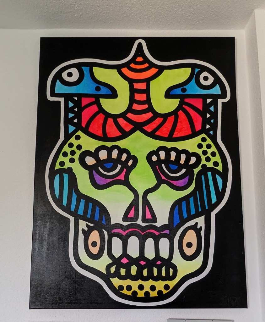 Ebenso wie der Totenkopf, den mein Freund Hans Reuschl gemalt hat, mich an die tickende, ablaufende Zeit gemahnt. Mein persönliches „Memento mori“.